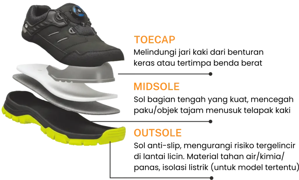 Fitur : Composite Toe Cap (Non-Metal), Anti-Static, Insole Breathable (Sirkulasi Udara).